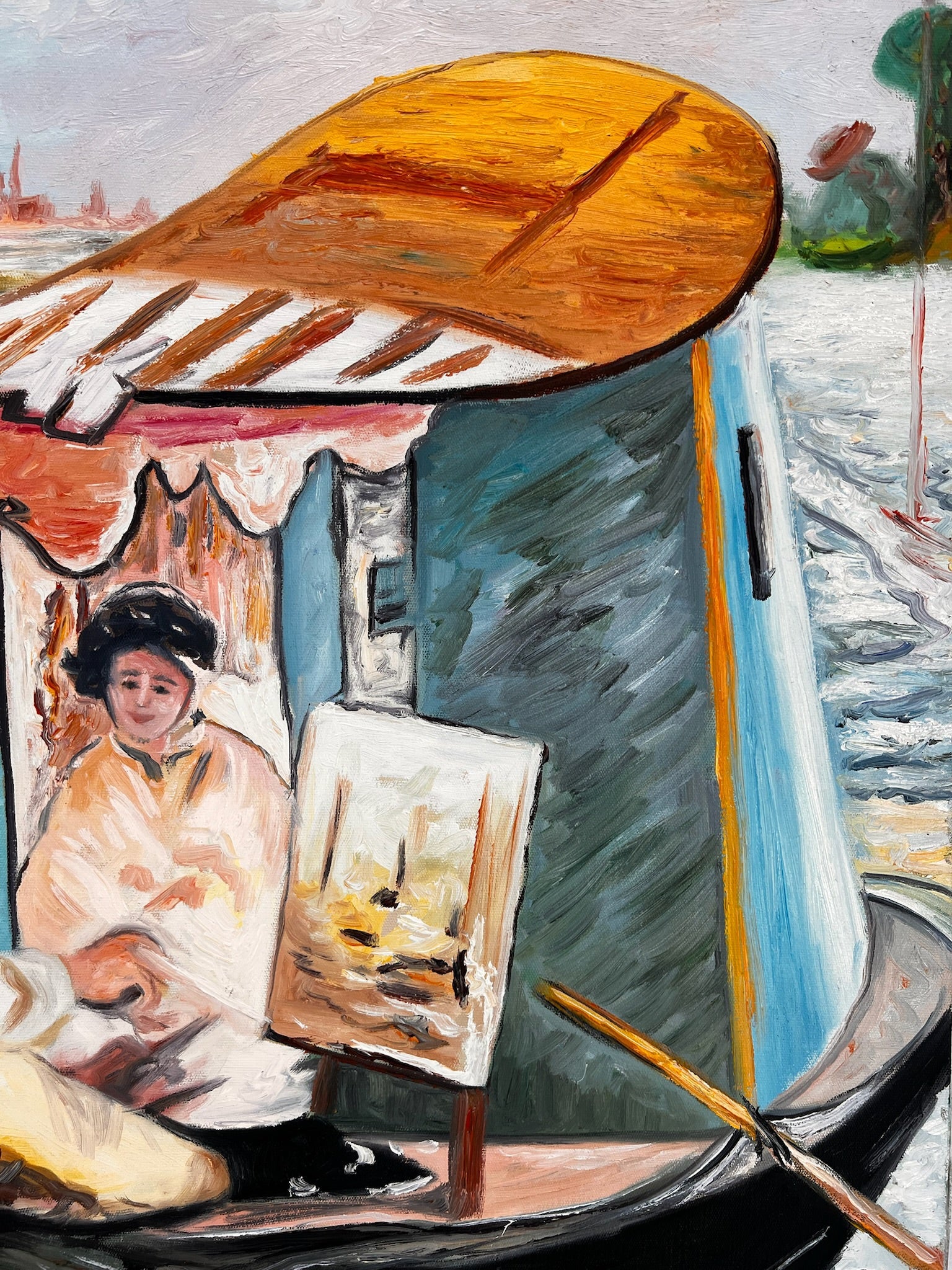 Dit schilderij is een handgeschilderde replica van Le Déjeuner sur l’Herbe, waarin Claude Monet zijn impressionistische stijl tot uitdrukking bracht. Het tafereel toont een schilder en zijn model in een boot, badend in een spel van licht en reflecties. De losse penseelstreken, frisse kleuren en levendige compositie maken het werk een voorbeeld van de impressionistische benadering: de natuur en het moment vangen in al zijn spontaniteit.