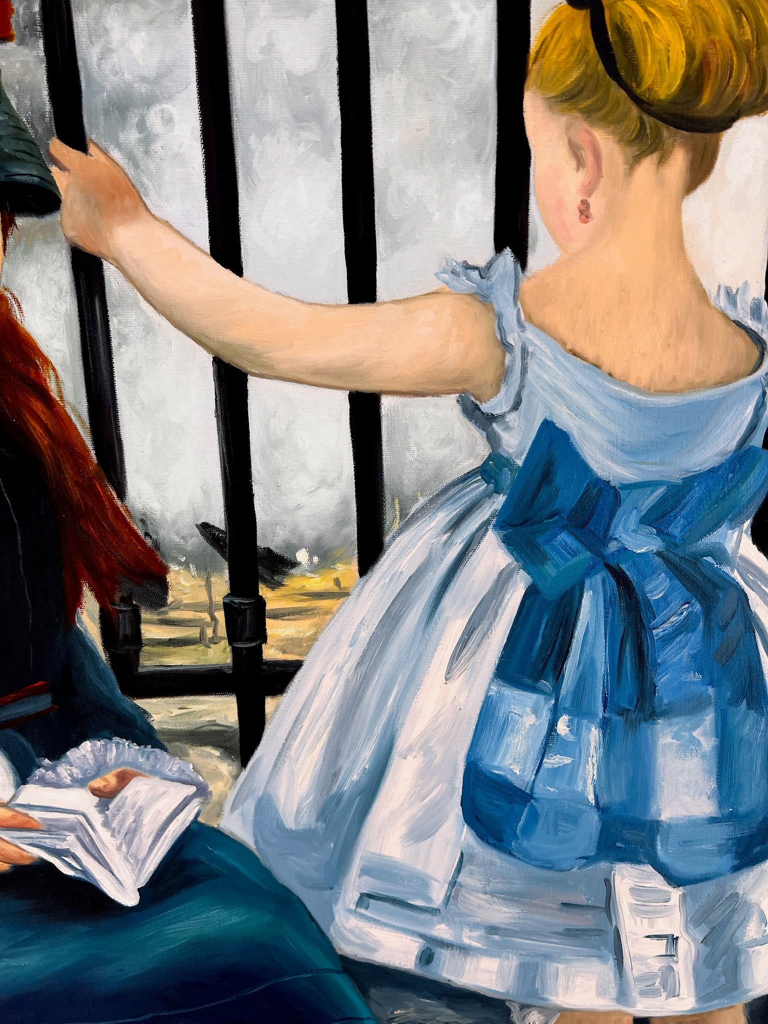 Dit handgeschilderde werk is een replica van The Railway (ook bekend als La Gare Saint-Lazare), geschilderd door Édouard Manet in 1873. Het schilderij toont een intieme scène van een jonge vrouw die met een boek en een klein hondje zit, terwijl een meisje in een blauwe jurk nieuwsgierig uitkijkt naar de rookwolken van de treinen achter het hek.