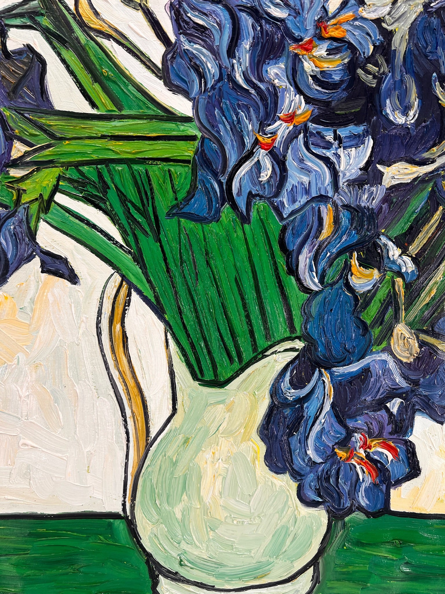 Vaas met irissen (naar Vincent van Gogh) – Handgeschilderd post-impressionistisch olieverfschilderij op doek (73 × 92,5 cm)