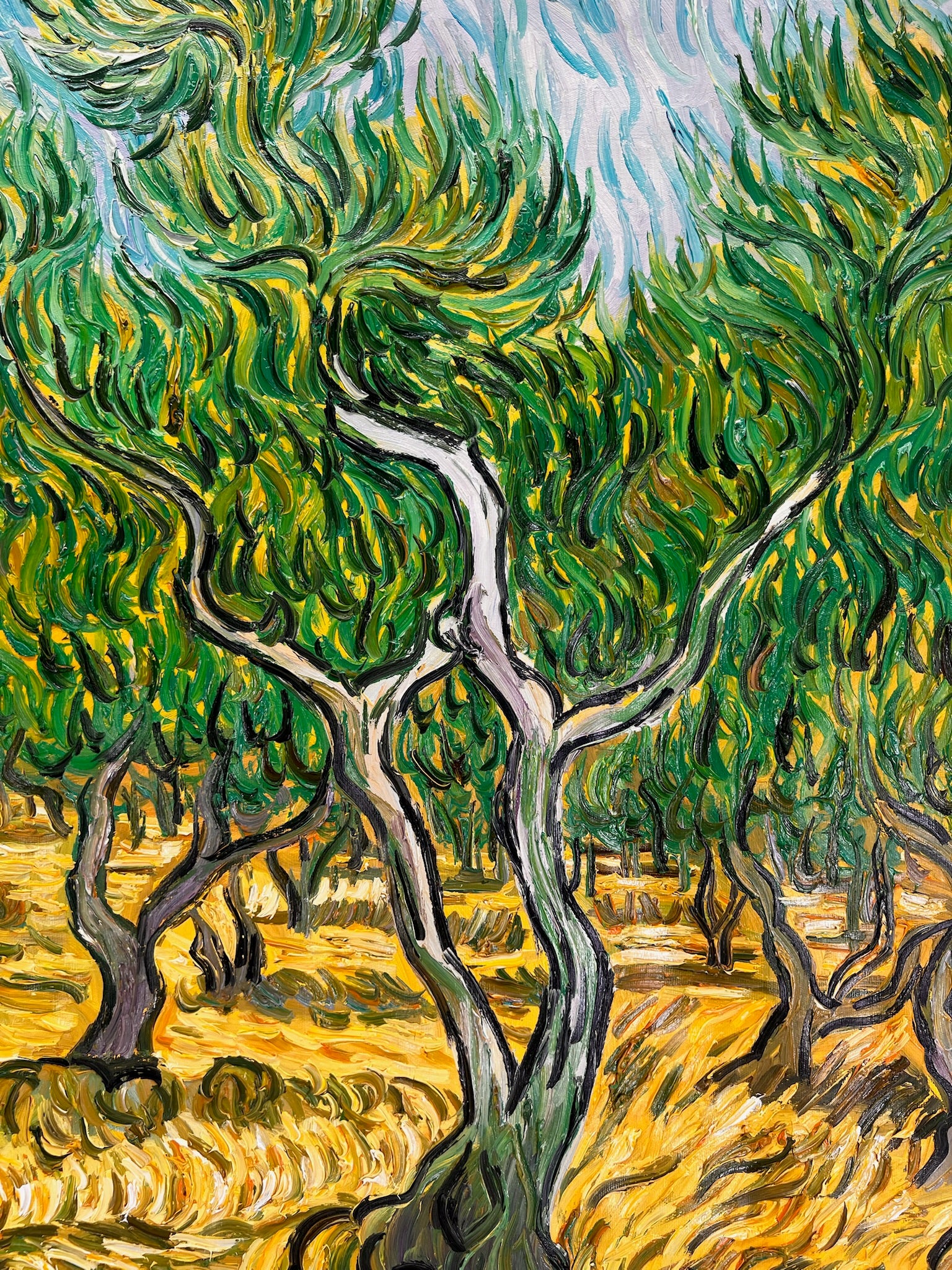 Dit kunstwerk straalt beweging uit, met dynamische wervelingen in de lucht en expressieve lijnen in de knoestige olijfbomen en het gouden veld. De handgeschilderde replica behoudt de kracht en textuur van Van Gogh’s penseelstreken en vormt zo een prachtig en levendig middelpunt voor elke ruimte.