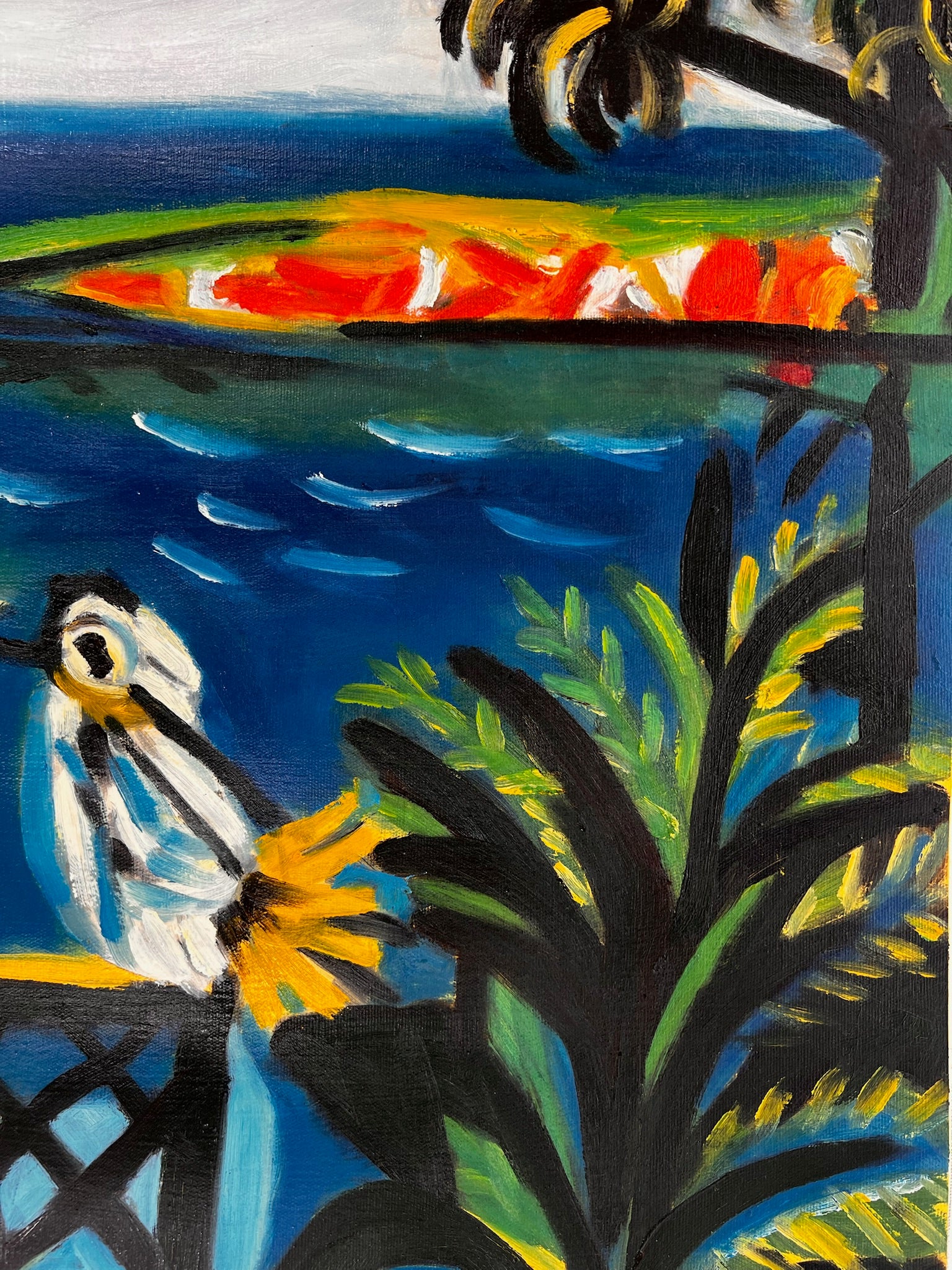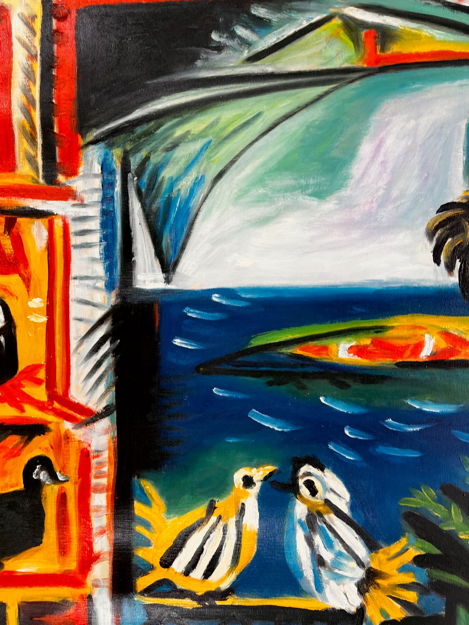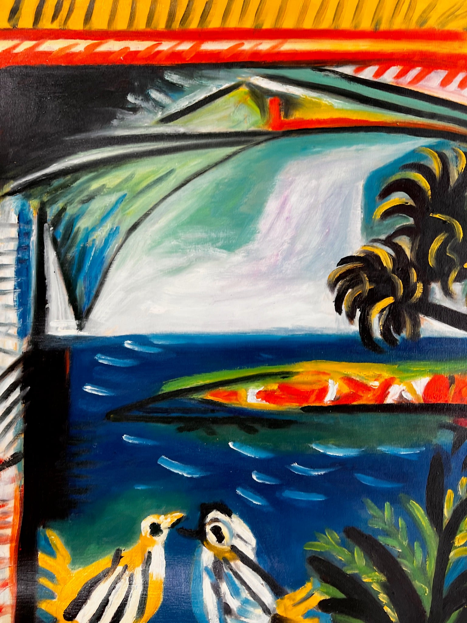 Dit schilderij is geïnspireerd op Picasso’s kleurrijke weergaven van het Middellandse Zeegebied, waar hij een groot deel van zijn leven doorbracht. Met felle rood- en geeltinten, diepblauw water en levendige accenten van vogels, vissen en planten, ademt het werk de sfeer van de Côte d’Azur.