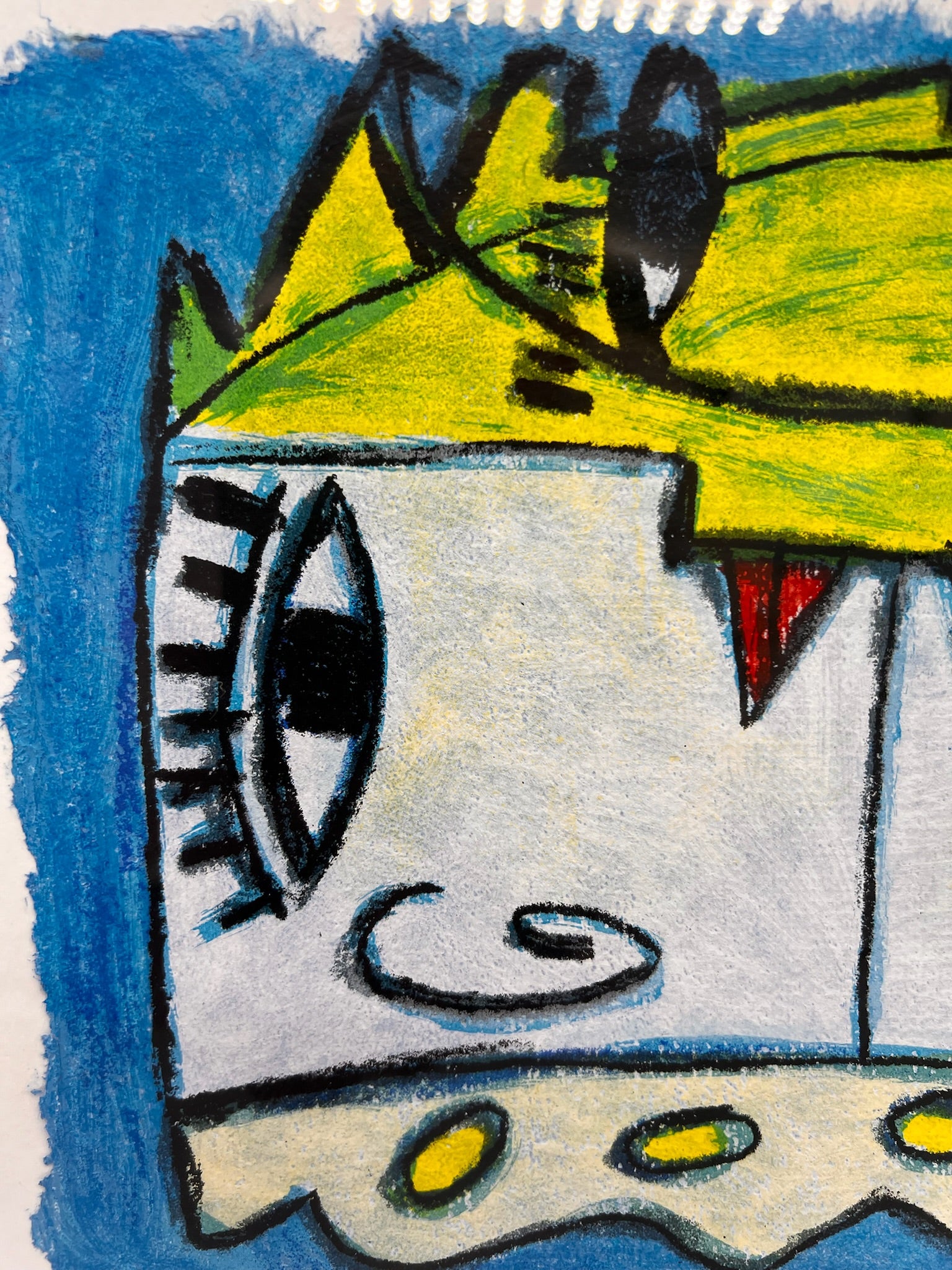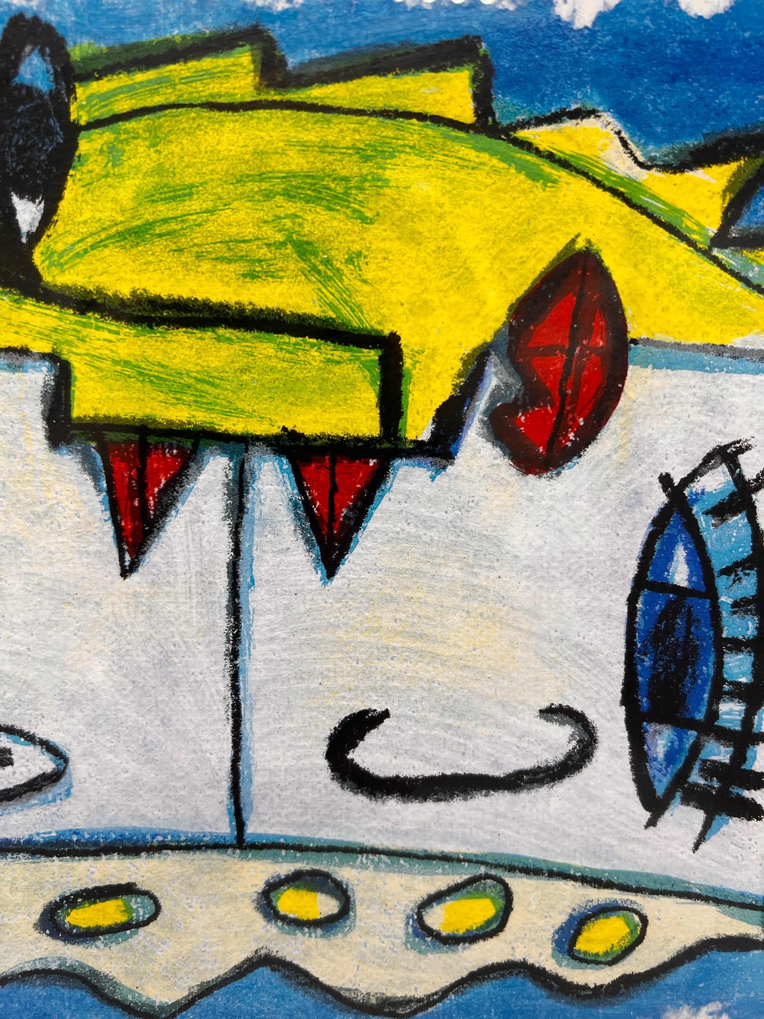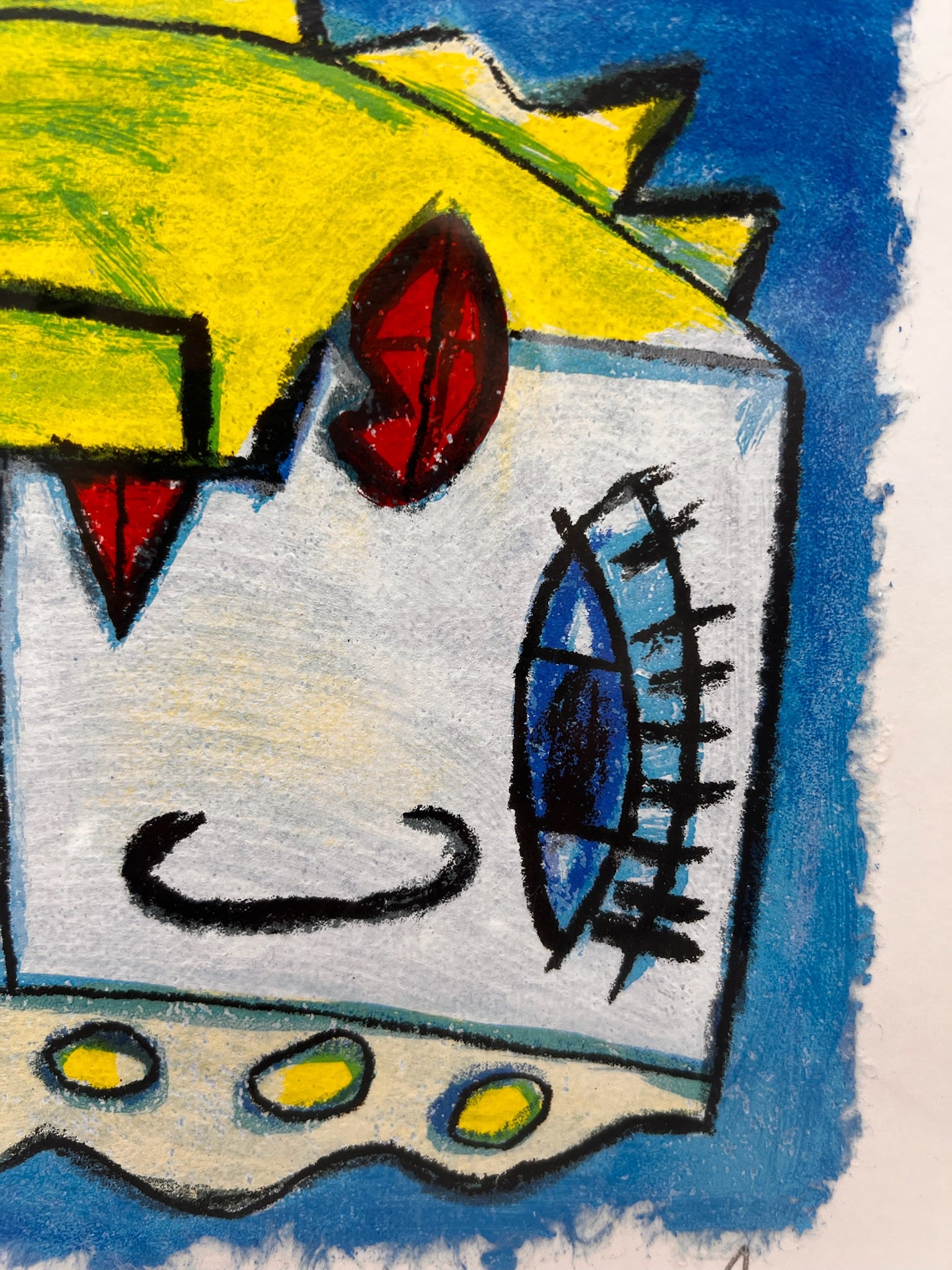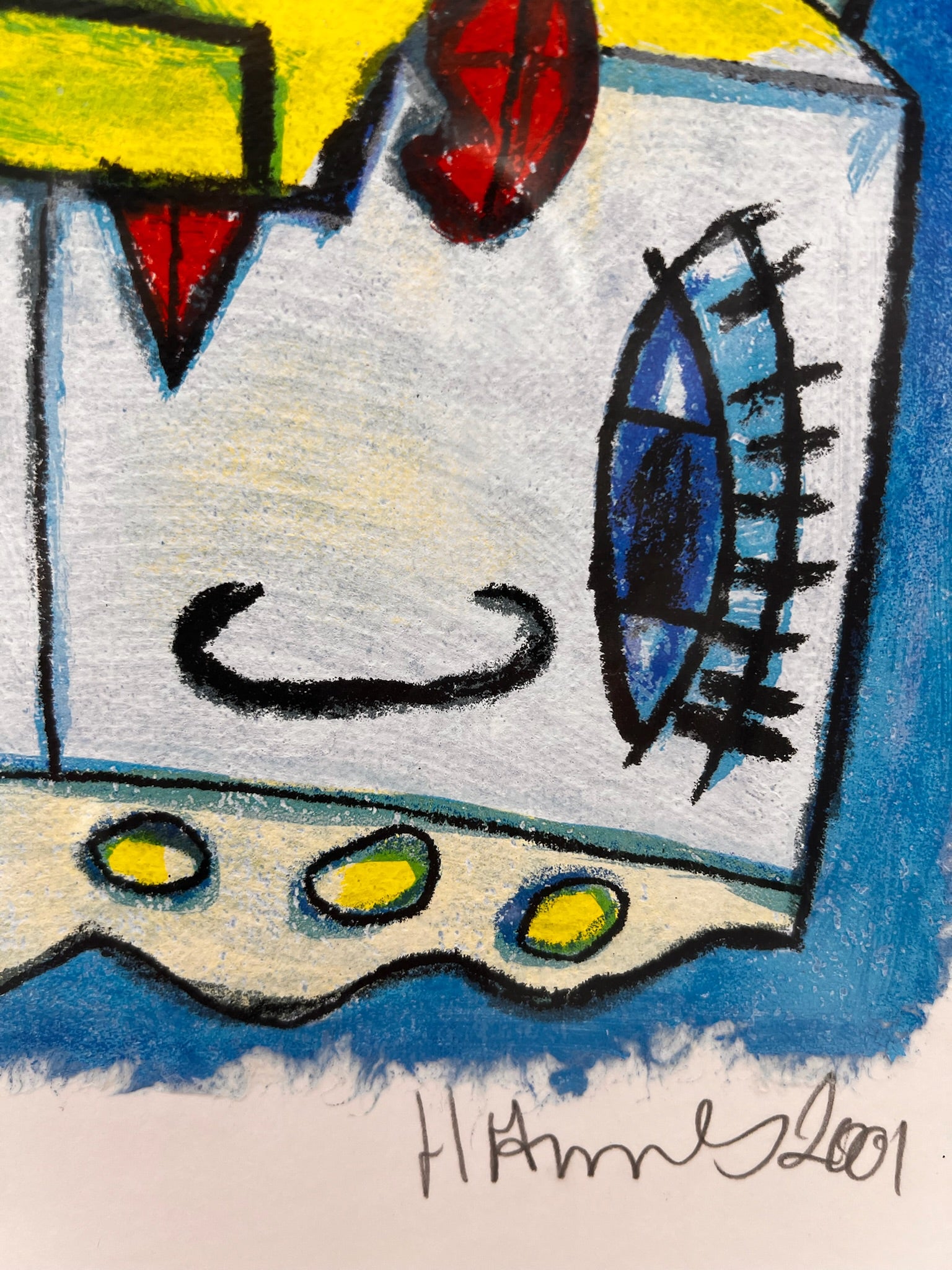 De stijl van Hannes in dit werk lijkt speels maar toch verfijnd, met surrealistische elementen die persoonlijkheid en diepte aan het stuk toevoegen. Het opvallende geel, blauw en rode kleurenpalet versterkt de visuele impact.