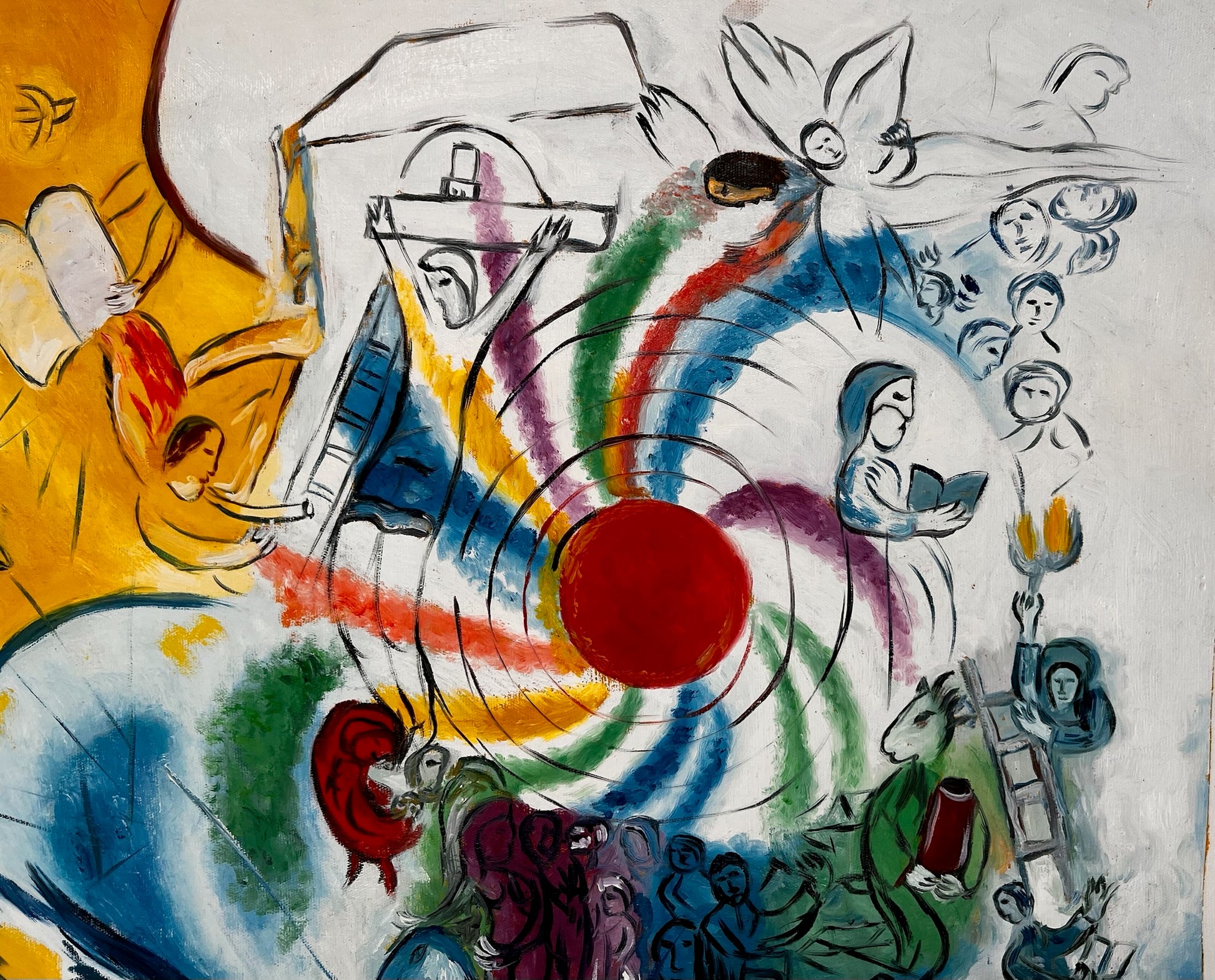 De handgeschilderde replica vangt de essentie van Chagall’s werk, met levendige kleuren en subtiele details die een verhaal van verbeelding en emotie vertellen. Dit kunstwerk is een prachtige toevoeging voor kunstliefhebbers die houden van modernisme en spirituele symboliek.