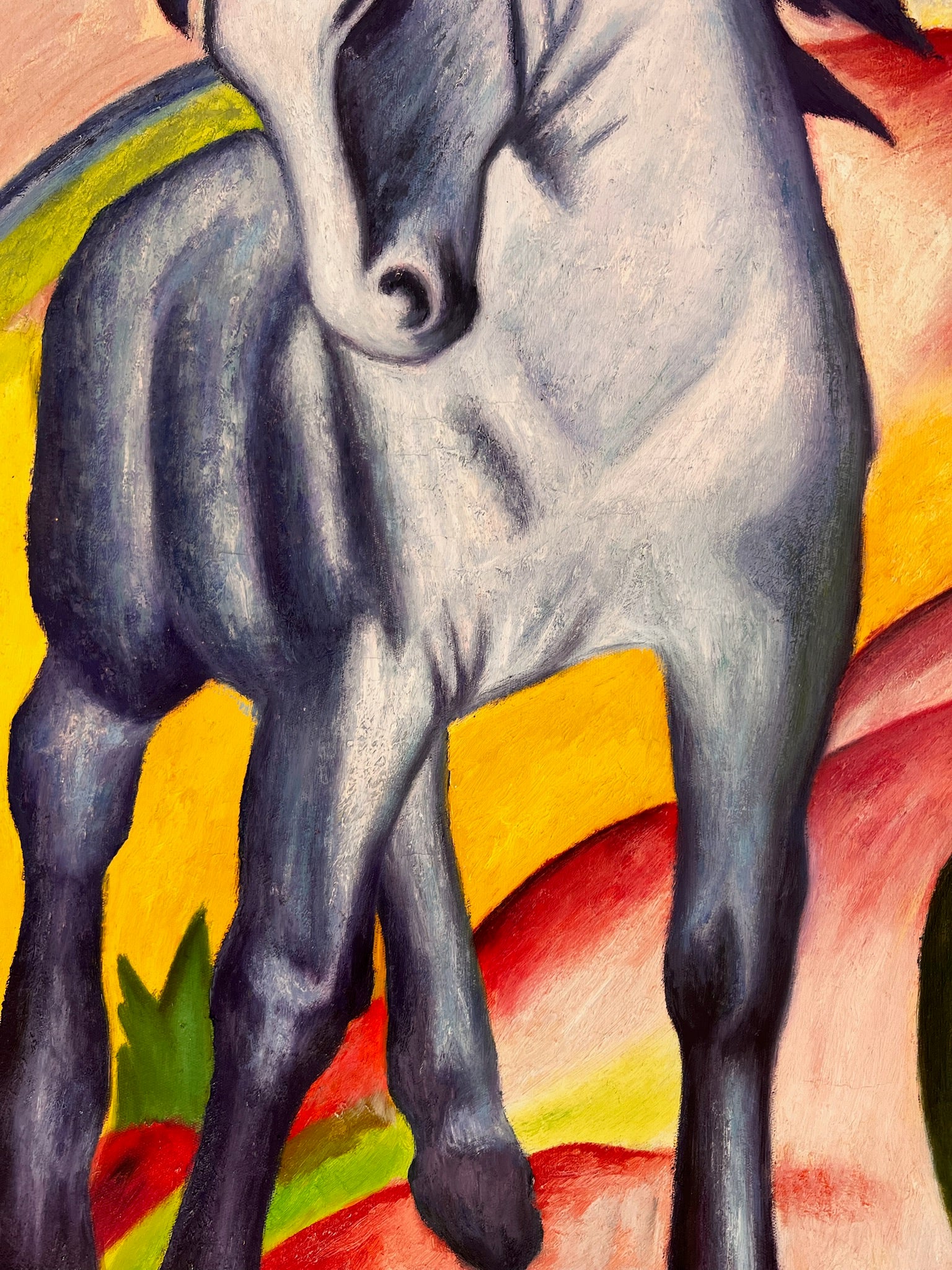 Dit schilderij is een handgeschilderde replica van Blaues Pferd I (1911), een van Franz Marcs meest iconische werken. Het toont een expressieve voorstelling van een blauw paard, liggend in een kleurrijke omgeving. Marc koos bewust voor blauw als symbool van spiritualiteit en innerlijke zuiverheid, in tegenstelling tot de aardse en materiële symboliek van andere kleuren.
