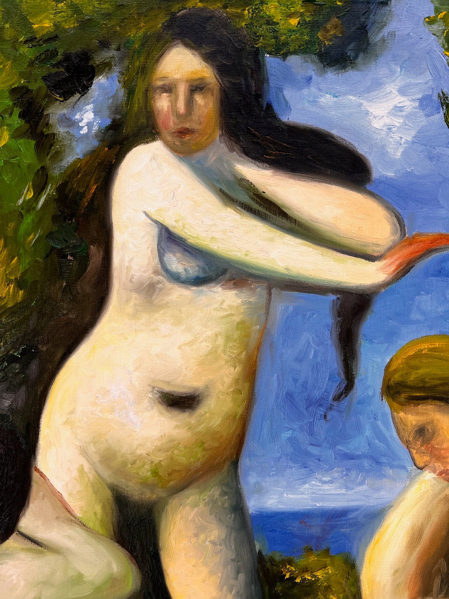 Dit prachtige handgeschilderde doek is geïnspireerd op Cézanne’s beroemde serie Baigneuses, waarin groepen badende vrouwen worden afgebeeld in een natuurlijke omgeving. Het schilderij toont drie naakten, weergegeven in krachtige penseelstreken en met aardse tinten die contrasteren met de helderblauwe lucht en groene vegetatie.