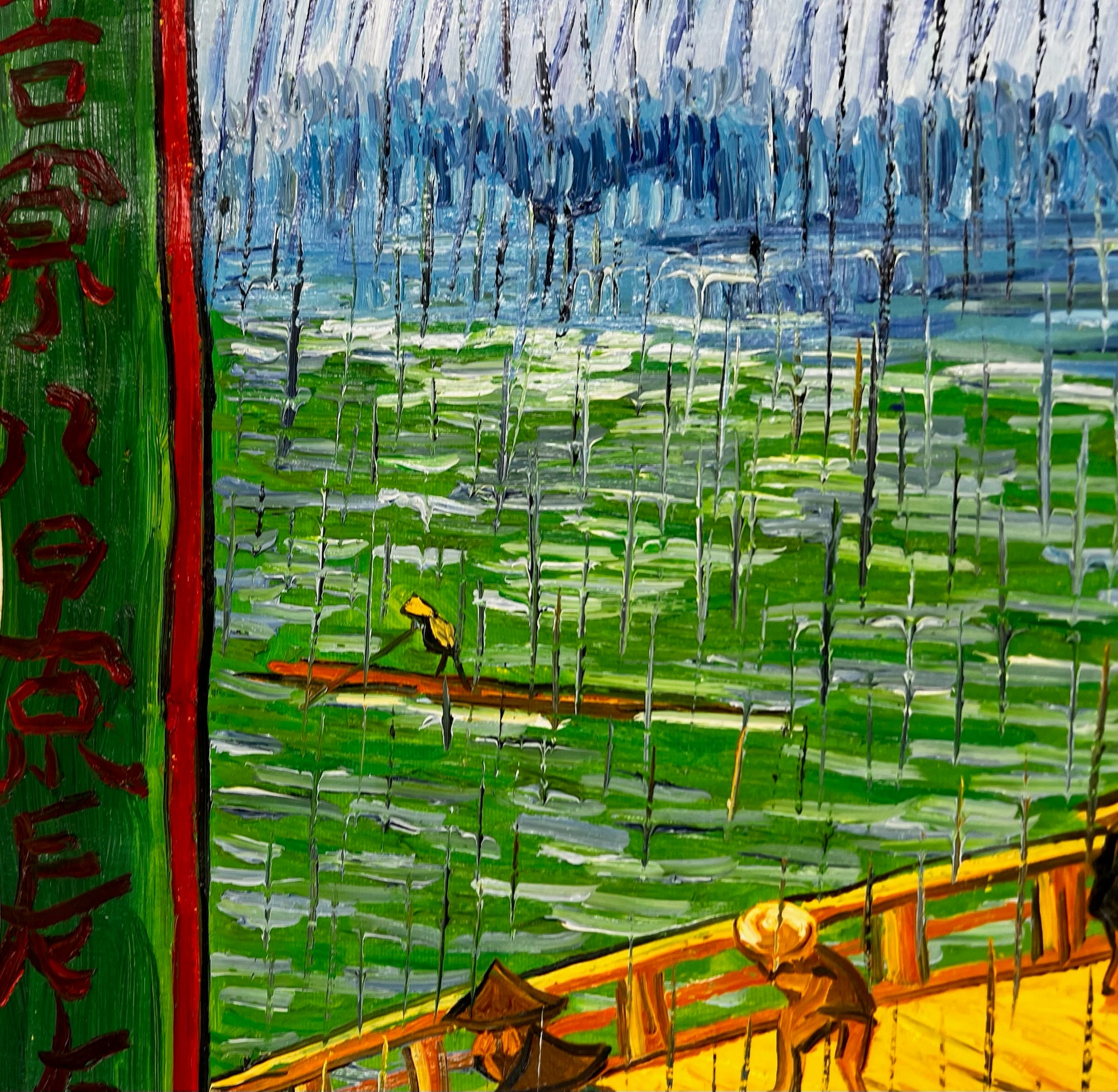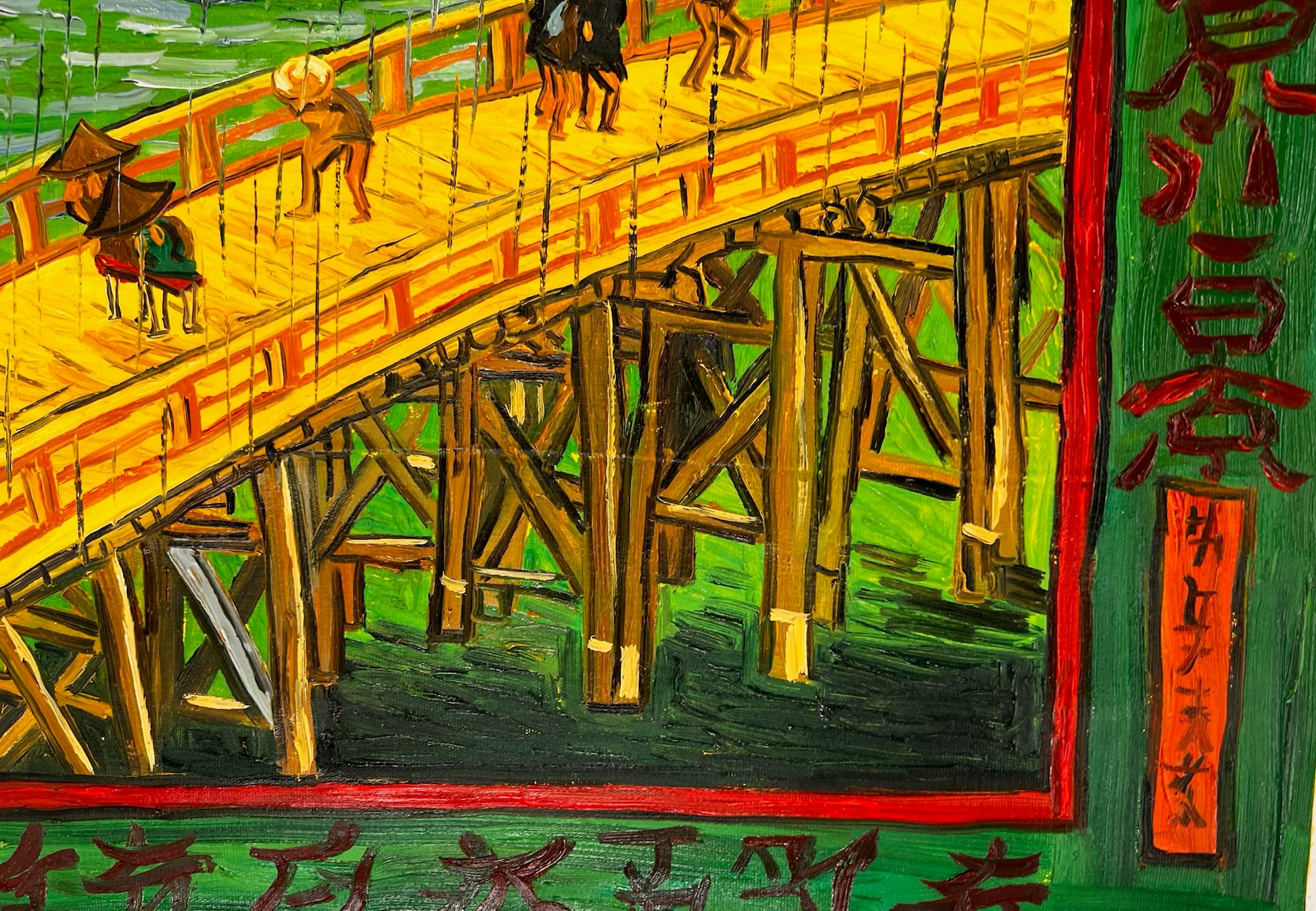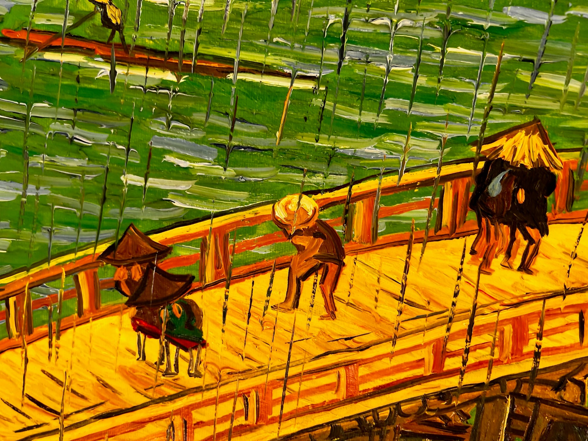 Dit kunstwerk toont een adembenemend tafereel van reizigers die een houten brug oversteken te midden van zware regenval. Geïnspireerd door de iconische houtsneden van Utagawa Hiroshige, vangt deze moderne herinterpretatie de levendige groenen van de rivier en de gedurfde gele kleuren van de brug met expressieve, textuurrijke penseelstreken. De opvallende verticale regendruppels en gedetailleerde figuren brengen een gevoel van leven en beweging in de compositie.