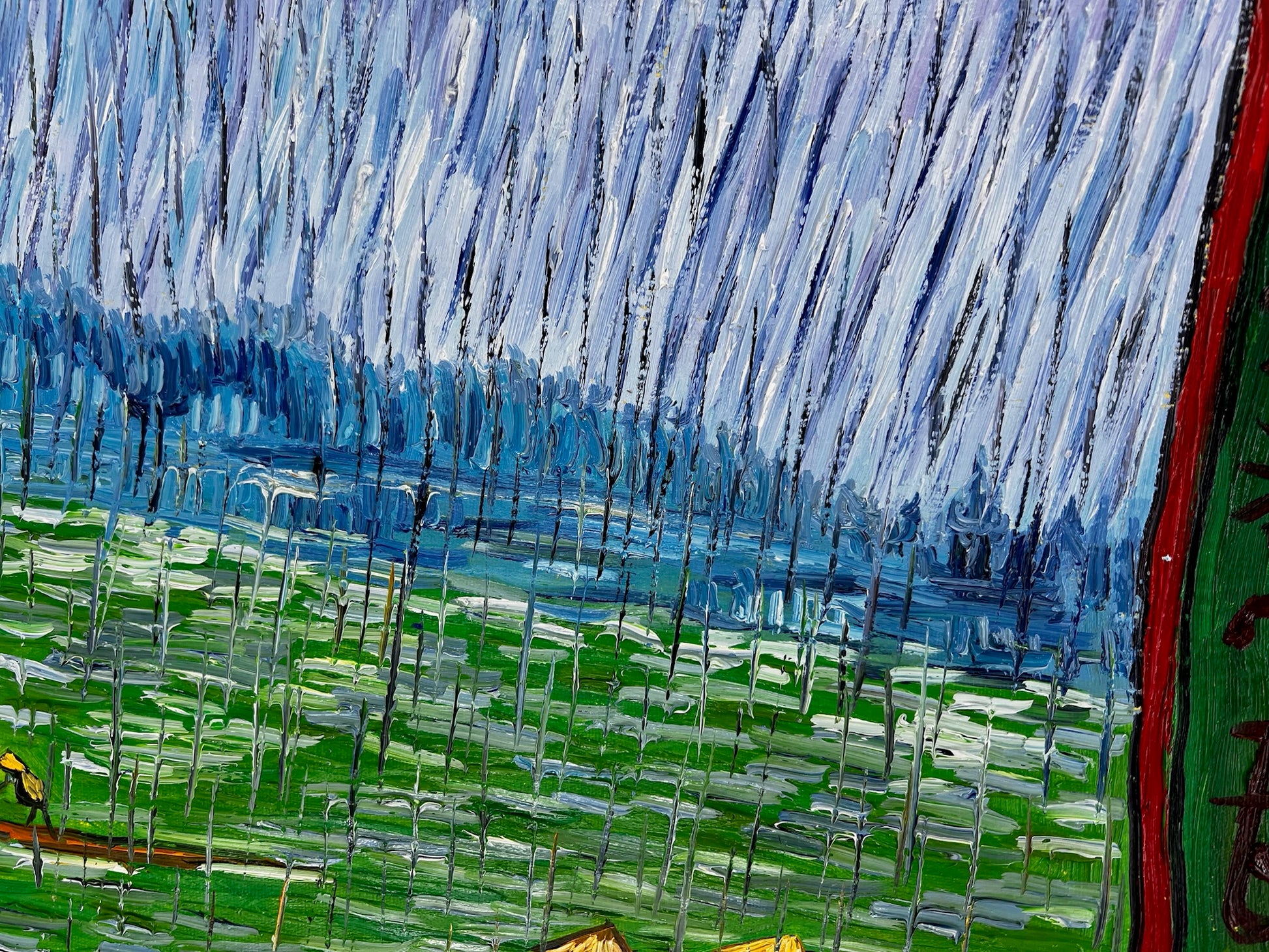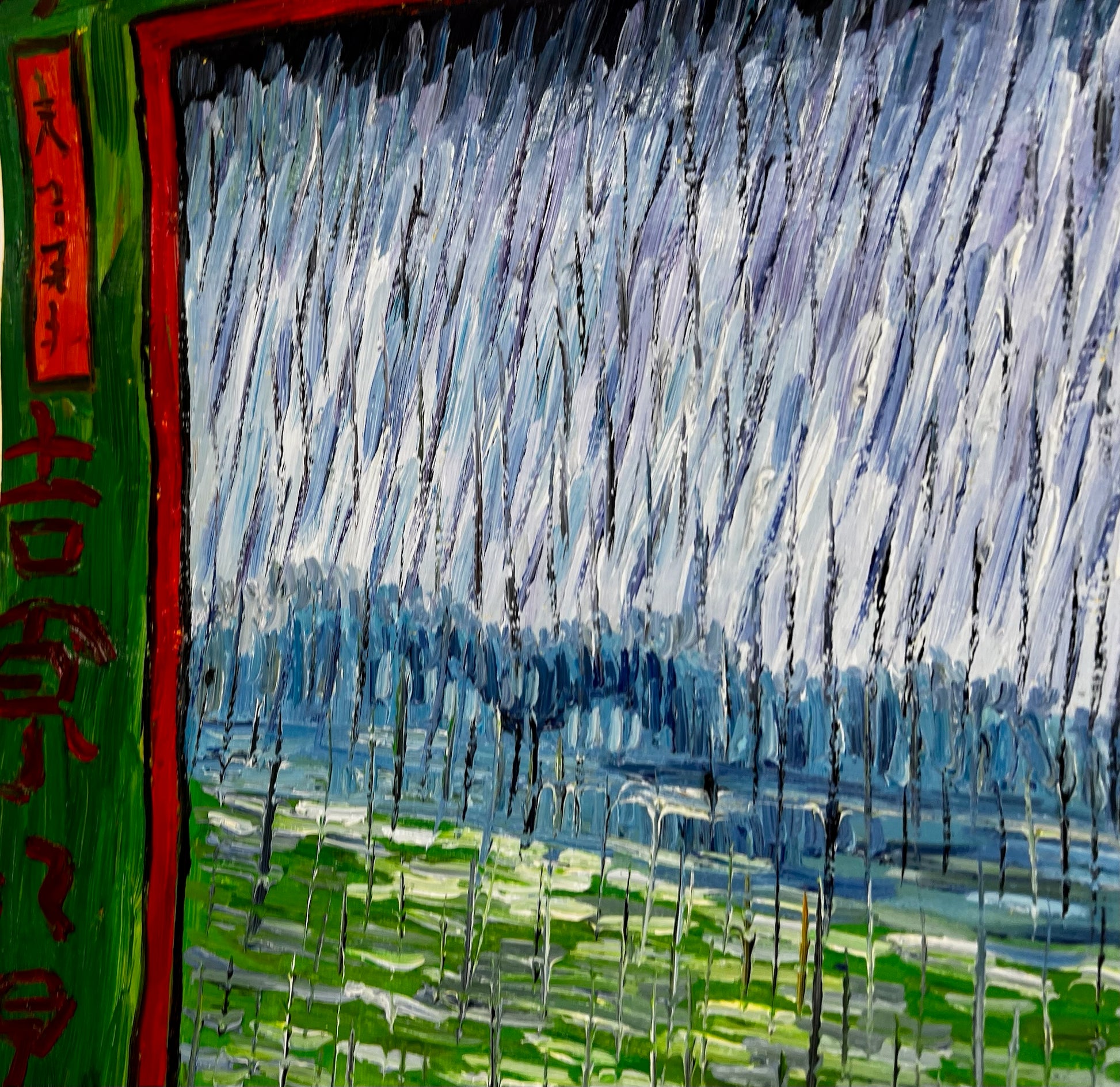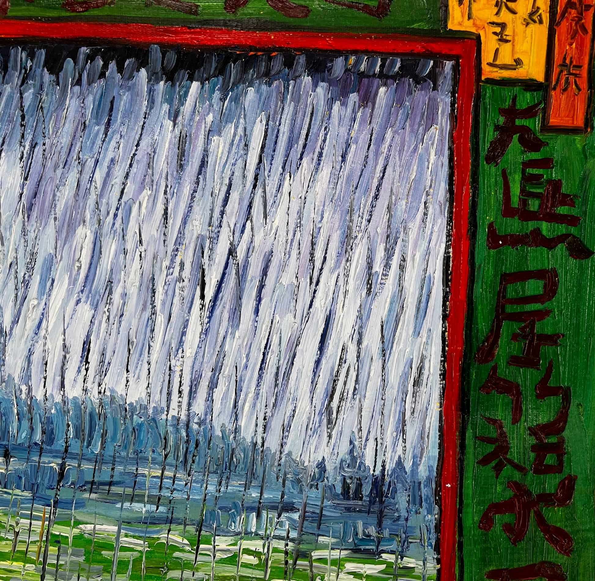 Dit kunstwerk toont een adembenemend tafereel van reizigers die een houten brug oversteken te midden van zware regenval. Geïnspireerd door de iconische houtsneden van Utagawa Hiroshige, vangt deze moderne herinterpretatie de levendige groenen van de rivier en de gedurfde gele kleuren van de brug met expressieve, textuurrijke penseelstreken. De opvallende verticale regendruppels en gedetailleerde figuren brengen een gevoel van leven en beweging in de compositie.