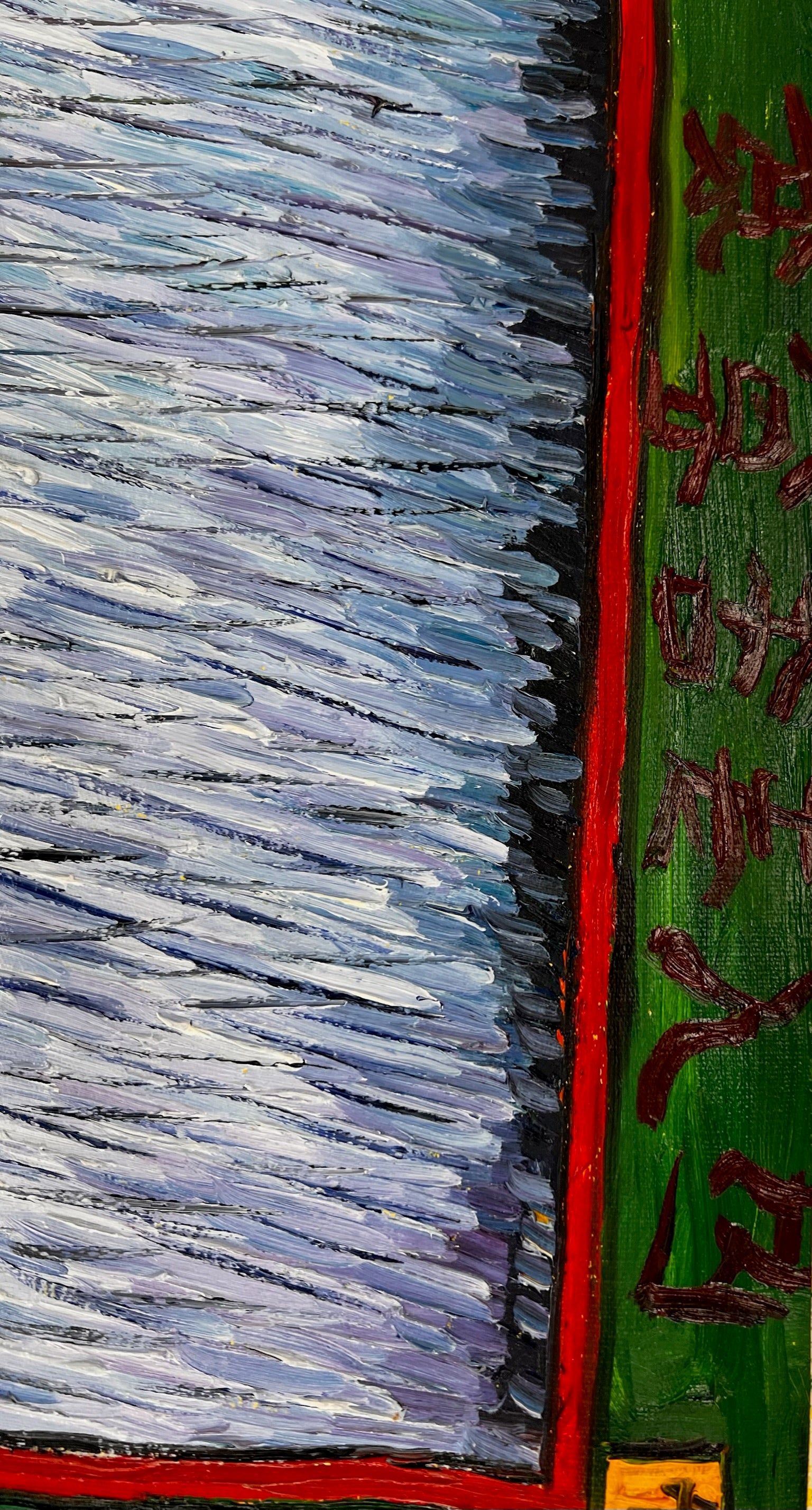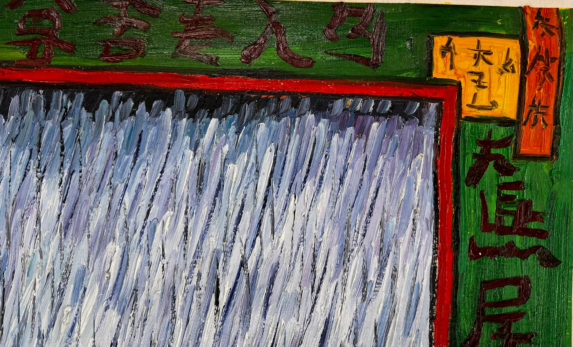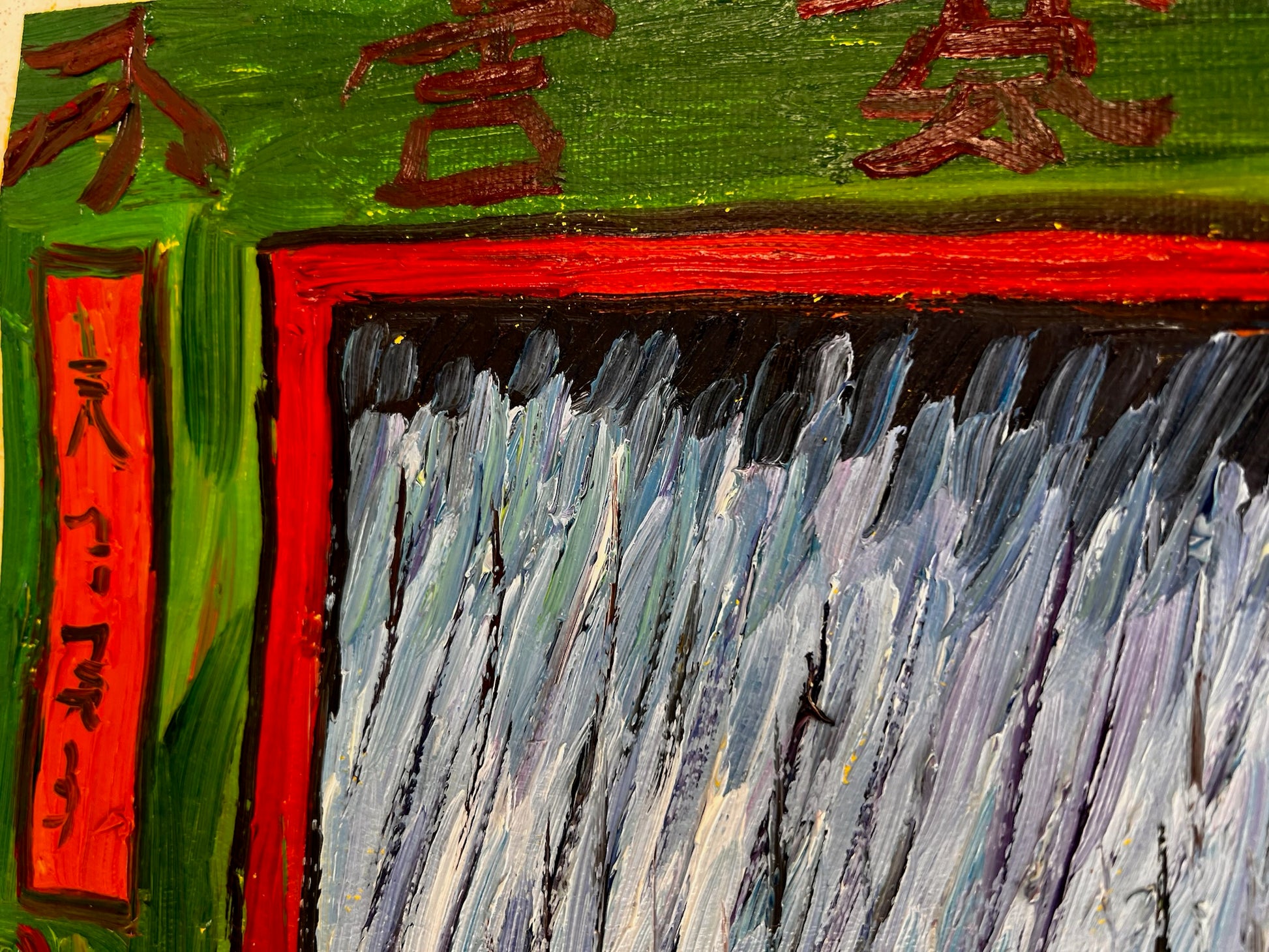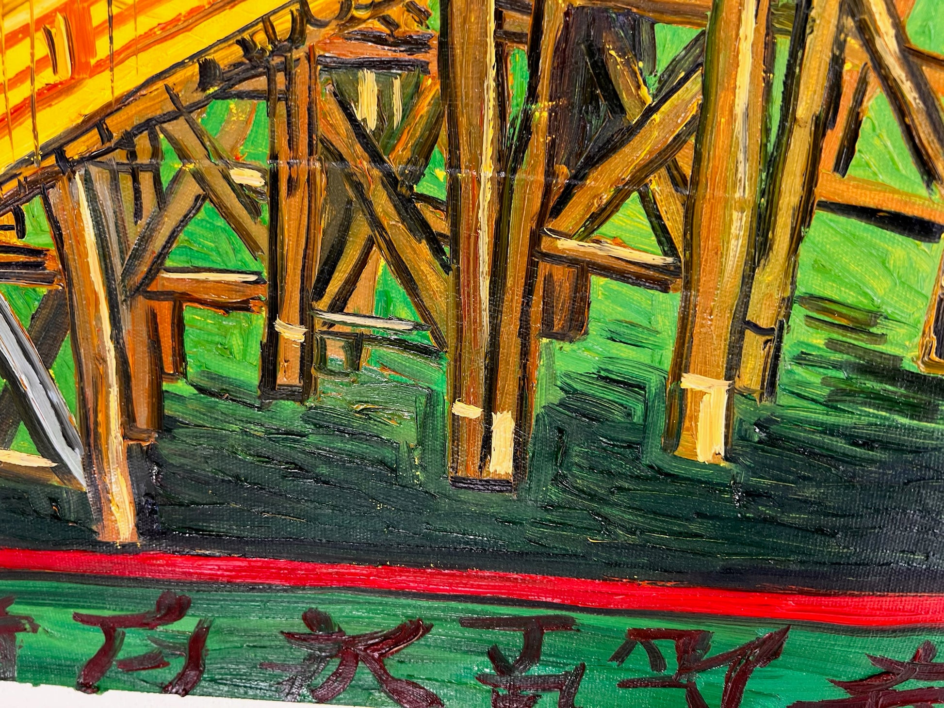 De schilderij bevat een gedurfde, rijk gekleurde rand versierd met Japanse karakters, wat diepte en culturele authenticiteit toevoegt. Deze replica valt op als een harmonieuze mix van traditionele Japanse esthetiek en de dynamische energie van moderne olieverfschilderkunst.